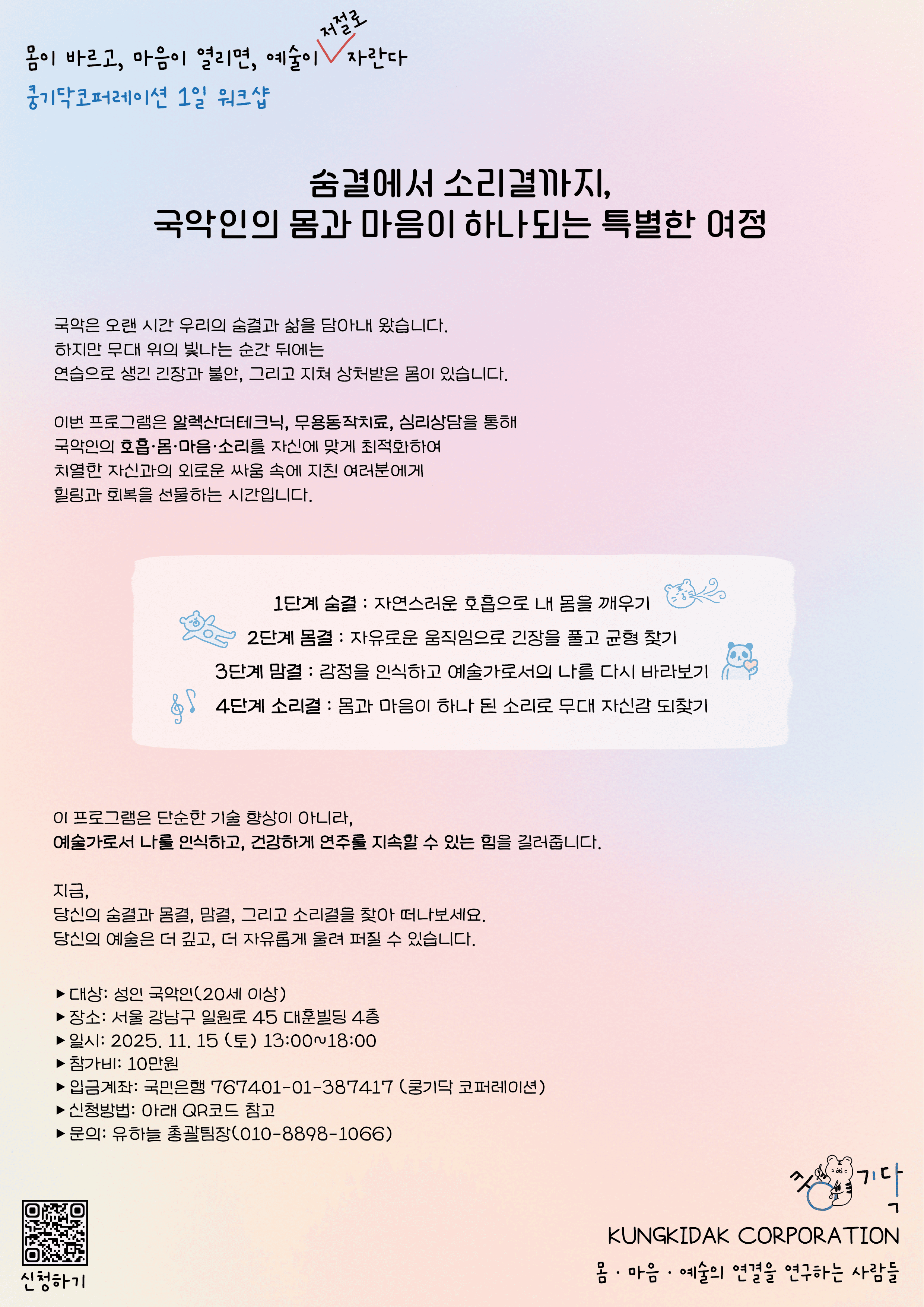 쿵기닥은 이번 워크숍을 통해 국악인들이 자신의 몸과 마음을 다시 바라볼 수 있는 시간,