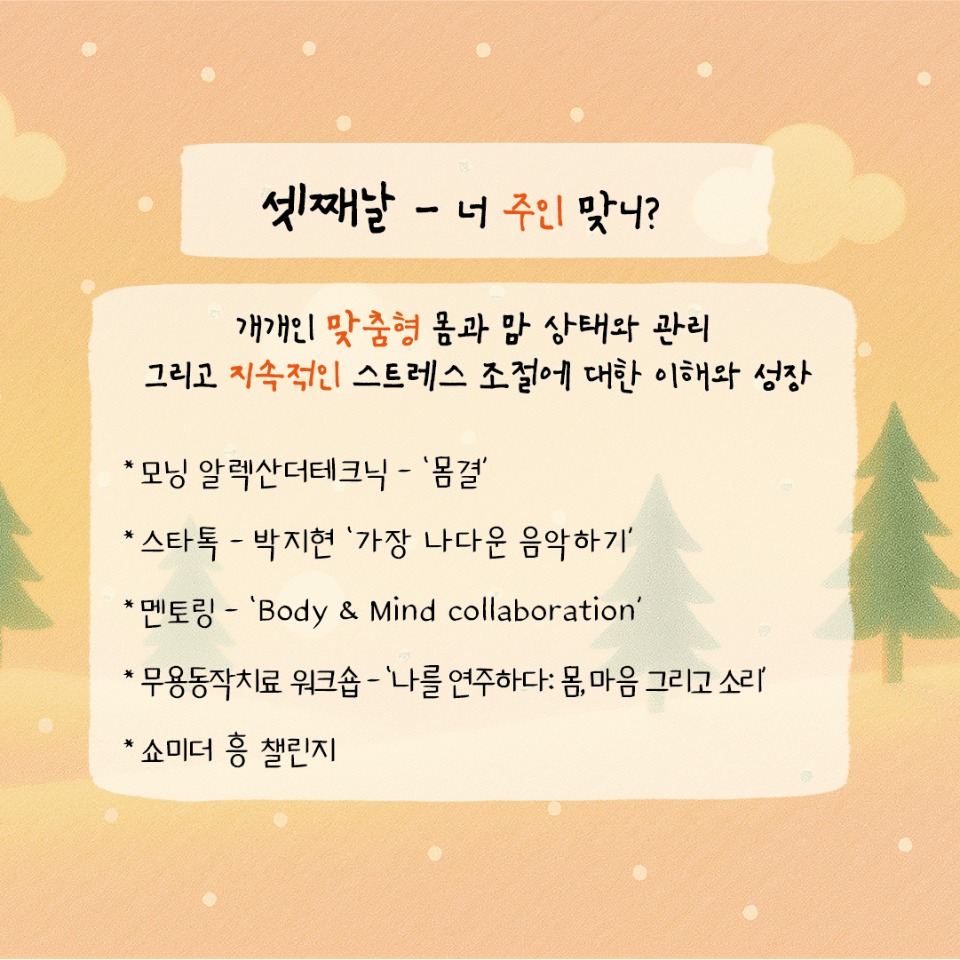 몸과 마음 상태를 이해하고, 지속적인 스트레스 조절과 자기 관리 능력을 키우는 날.